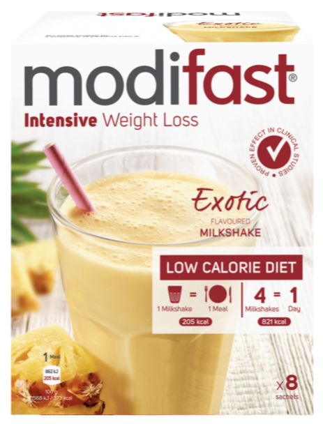 Modifast Intensive Weight Loss Milkshake Exotic is een tropische afslank-shake met de frisse smaak van yoghurt, ananas en een vleugje appel. De milkshake is snel klaar te maken en smaakt waanzinnig lekker! De Modifast Intensive shake is een complete maaltijdvervanger voor